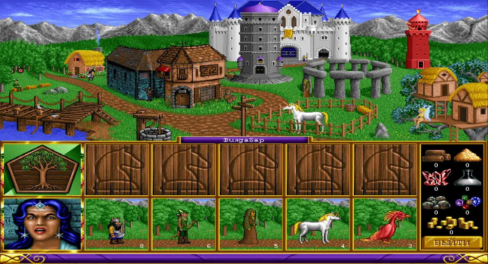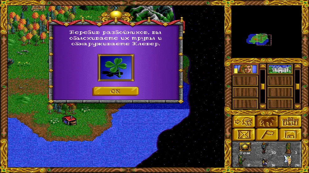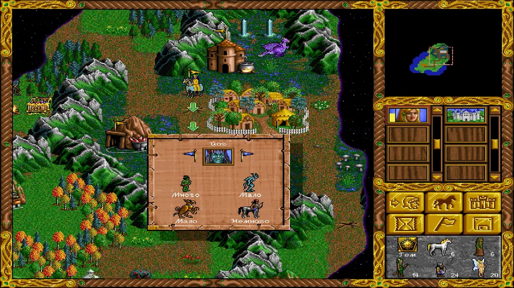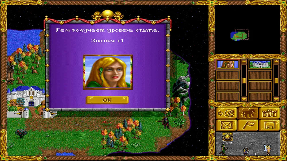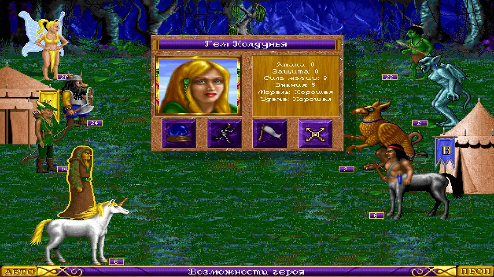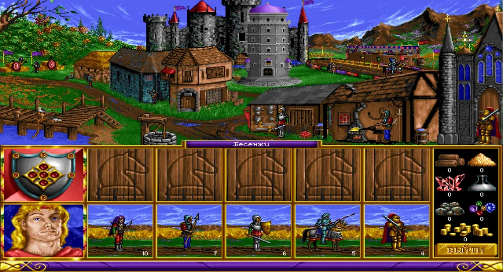 На стратегической карте мы будем перемещать наших рыцарей на конях, то есть героев. К слову, не все они рыцари на белых конях, есть и чародеи и принцессы и ведьмы. У каждого такого героя есть собственные характеристики, портрет и биография. Здесь и раскрываются ролевые элементы игры. Мы будем развивать героев по ходу игры.