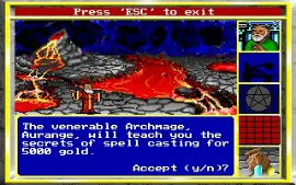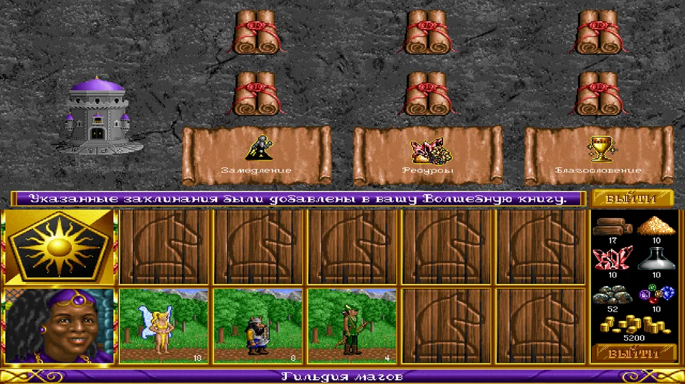 Все объекты интерактивны, а это значит, что мы сможем посетить все наши постройки. Например, посетив на экране города Стоунхендж, мы сможем нанять друидов, а заглянув в дерево-дом, ― нанять фей. На экране города есть и сам замок, зайдя в который мы увидим доступные опции строительства и развития замка, а также сможем нанимать героев. В гильдию магов можно зайти и увидеть на отдельном экране список доступных заклинаний. При посещении гильдии магов героем он учит все открытые в гильдии заклинания сразу. В игре нет привычного параметра маны, своеобразный аналог маны ― параметр «знание», вы сможете использовать каждое заклинание согласно вашему уровню «знания». Герой с четвертым уровнем знания может произносить каждое заклинание по четыре раза. А потом мы должны снова посетить гильдию магов для восполнения заклинаний. В последующих частях «Героев» такой системы магии больше не будет, а будут привычные нам очки маны. Всего в игре можно построить четыре этажа гильдии магов. Первый этаж дает нам три заклинания. Второй, третий и четвертый этажи принесут нам по два дополнительных заклинания каждый. Выбор заклинаний, которые вам достанутся при строительстве гильдии магов ― случайный. И порою, заклинания будут повторяться.