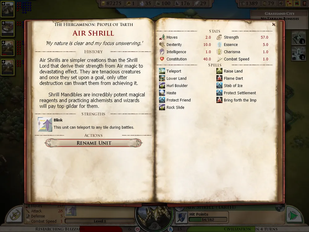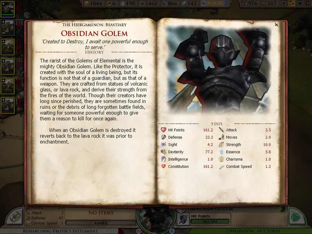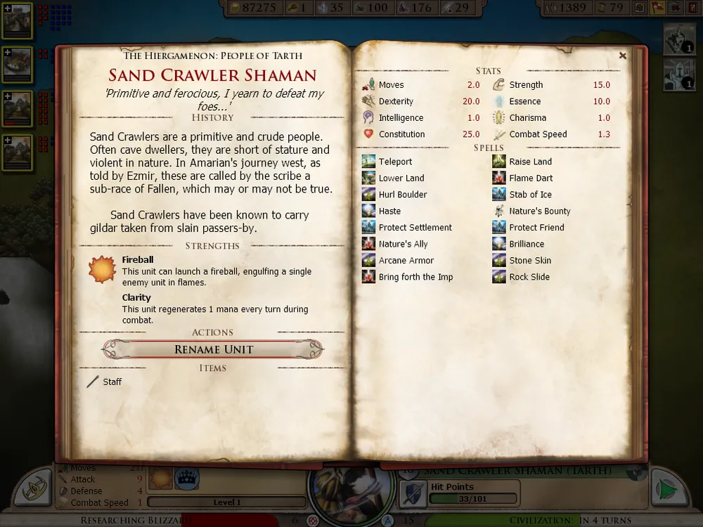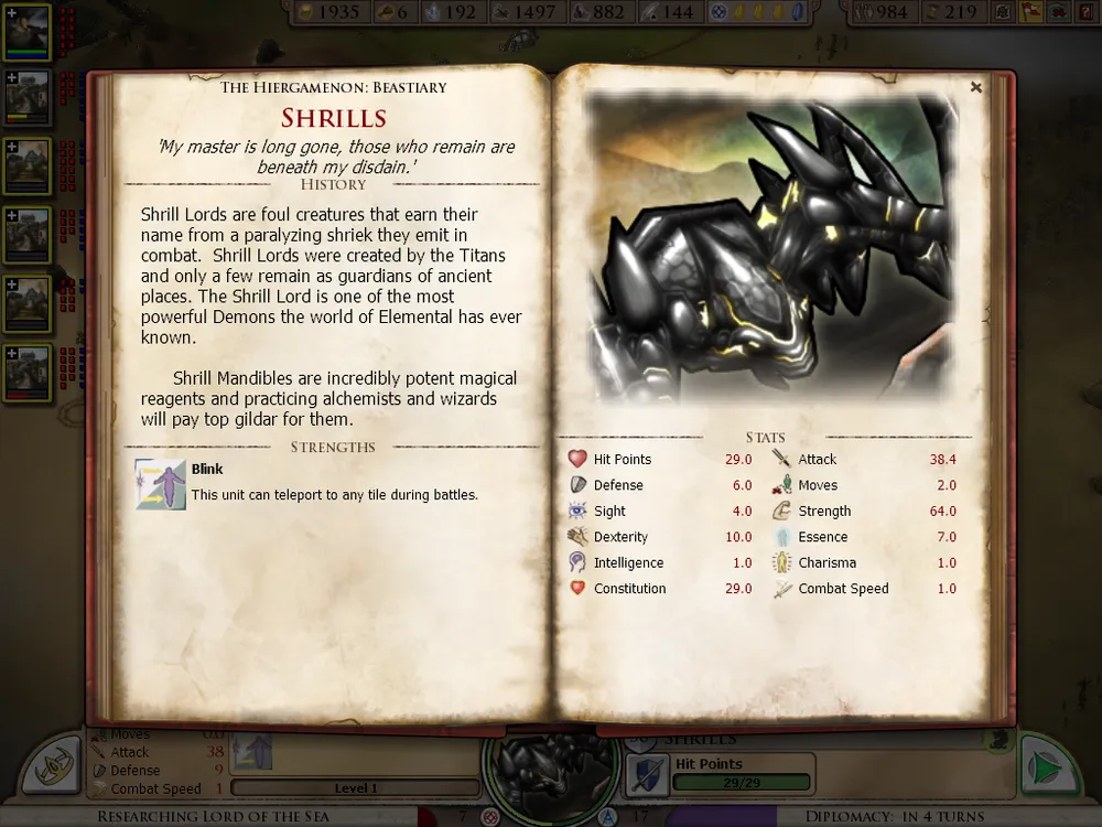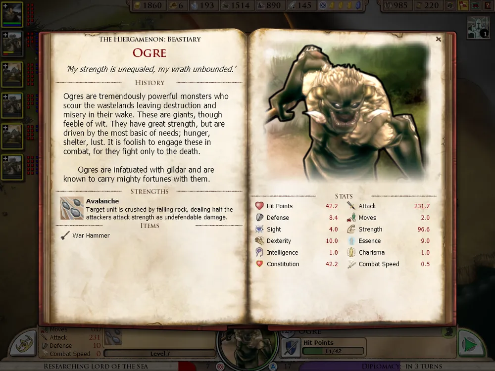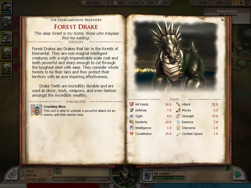 Очень интересная у него способность защищаться от атакующих заклинаний, правда магические умения по нему бьют (огненное дыхание на пример). Так же стоит отметить, что иногда за место представленного на картинке попадается урезанный вариант, который не имея двух особых способностей оценивается всего на 4 очка ниже, что явно свидетельствует о том что очки по большей части не качественный, а количественный показатель, так как в тактическом бою такие умения явно дороже чем просто пара ХП. В общем смотреть на очки рейтинга не всегда стоит, что очень сильно напоминает - "У диабло понтов было много, а боец он никакой... Зарезал я его как свинью, заработал много експирианса и получил левел ап" (с). Я лично побеждал армии в тактическом бою превосходящие по очкам меня в два раза (при почти равном количестве юнитов).