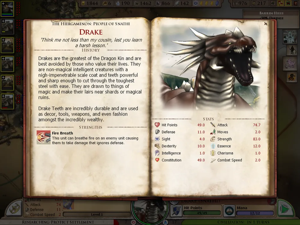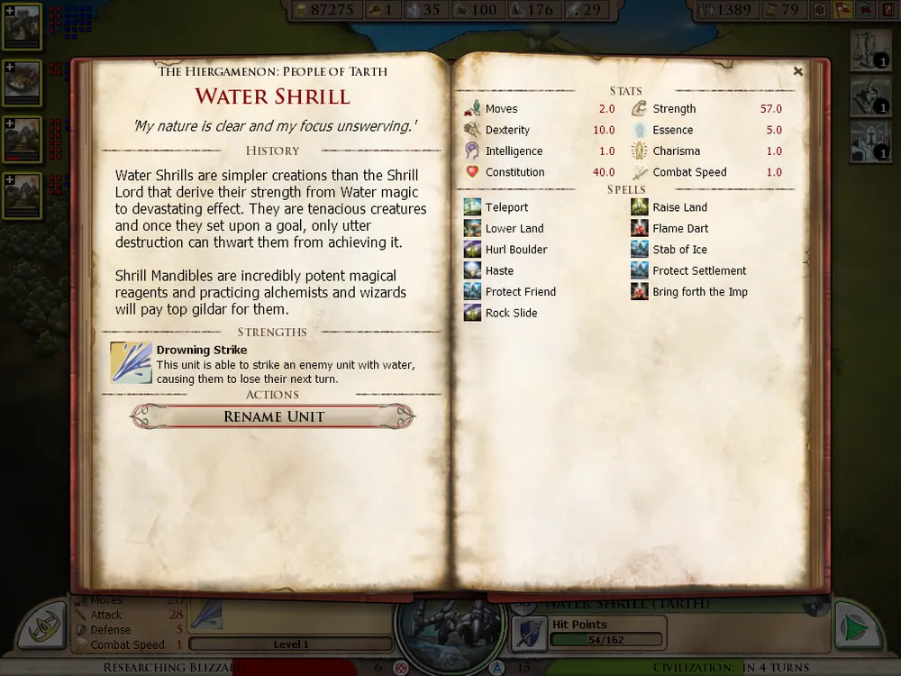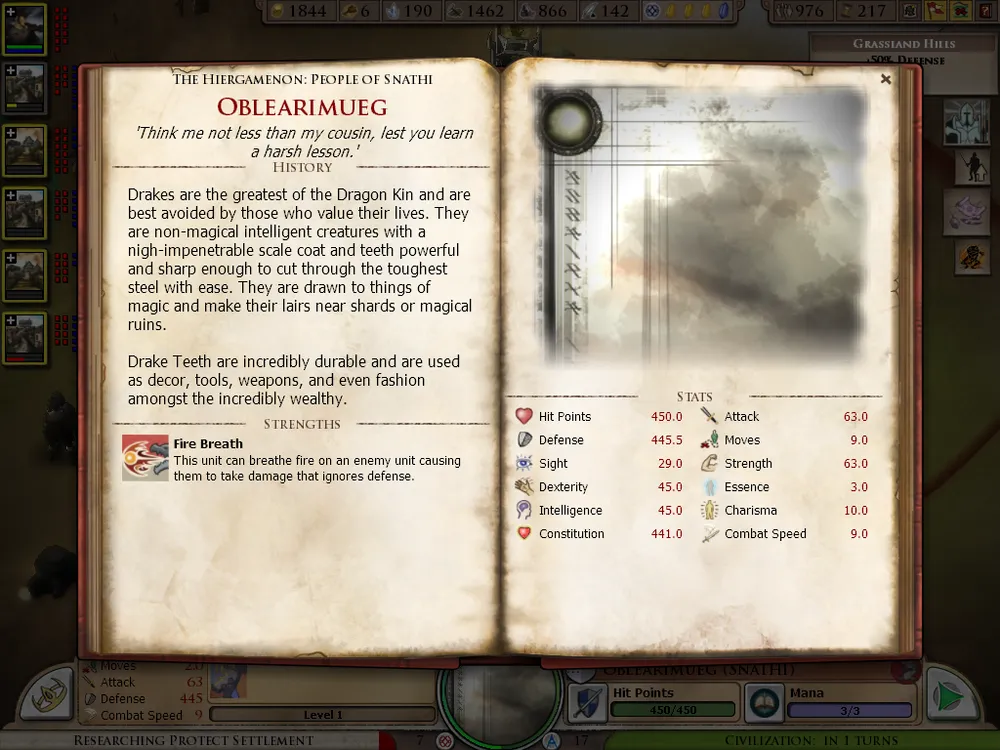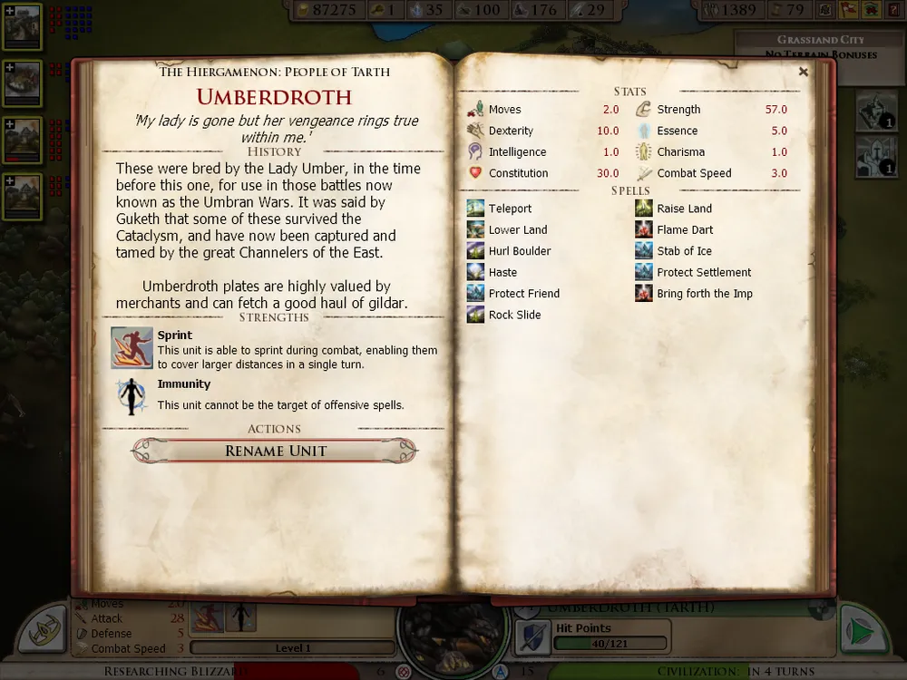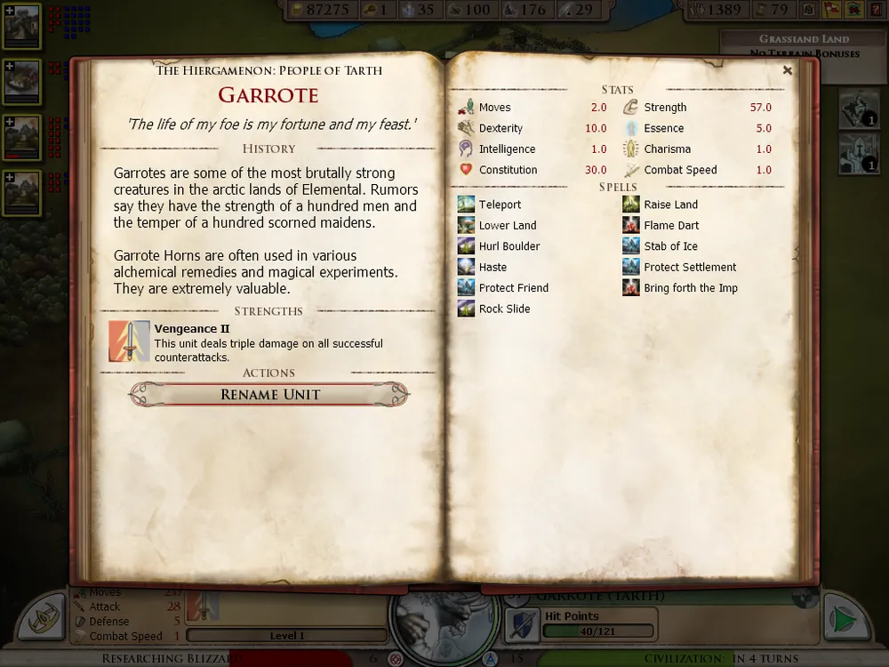 Очень интересная у него способность защищаться от атакующих заклинаний, правда магические умения по нему бьют (огненное дыхание на пример). Так же стоит отметить, что иногда за место представленного на картинке попадается урезанный вариант, который не имея двух особых способностей оценивается всего на 4 очка ниже, что явно свидетельствует о том что очки по большей части не качественный, а количественный показатель, так как в тактическом бою такие умения явно дороже чем просто пара ХП. В общем смотреть на очки рейтинга не всегда стоит, что очень сильно напоминает - "У диабло понтов было много, а боец он никакой... Зарезал я его как свинью, заработал много експирианса и получил левел ап" (с). Я лично побеждал армии в тактическом бою превосходящие по очкам меня в два раза (при почти равном количестве юнитов).