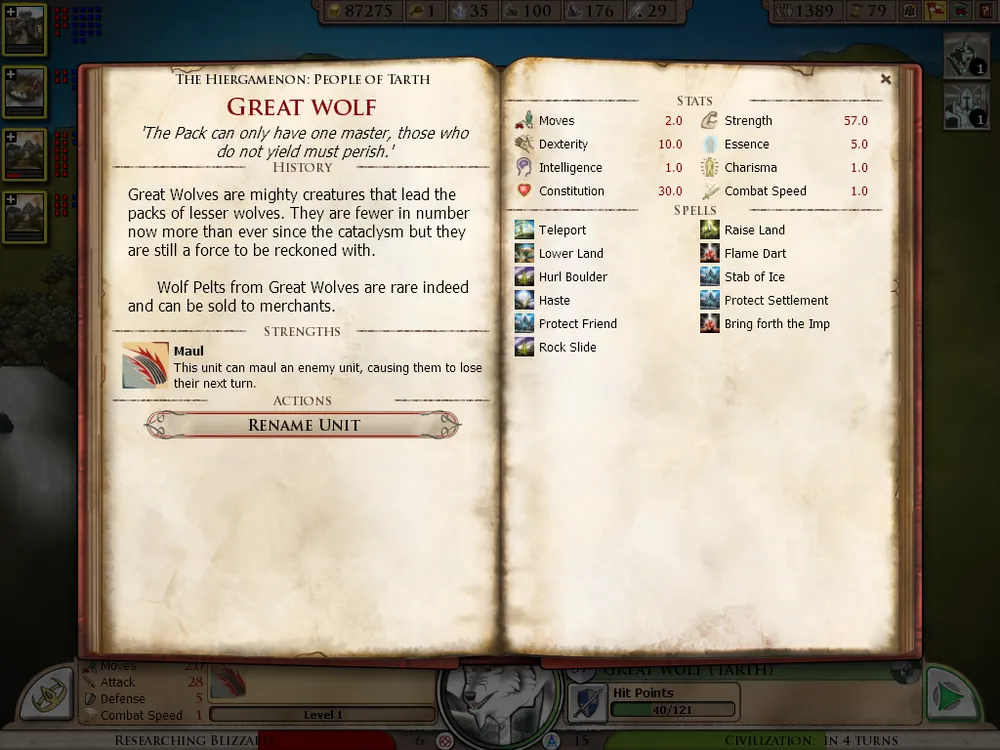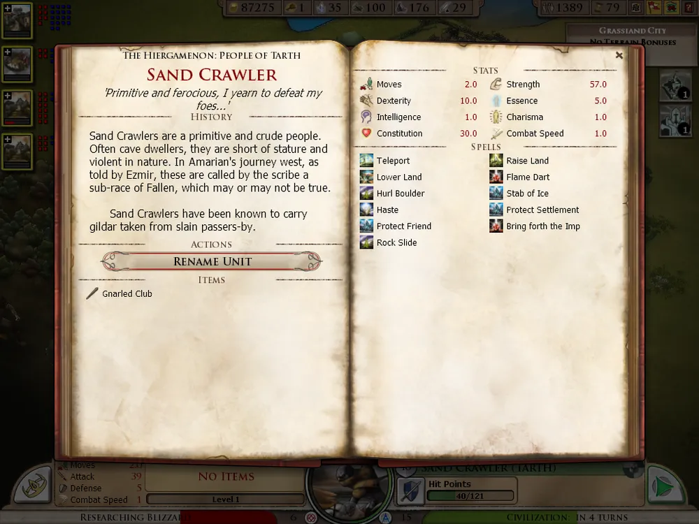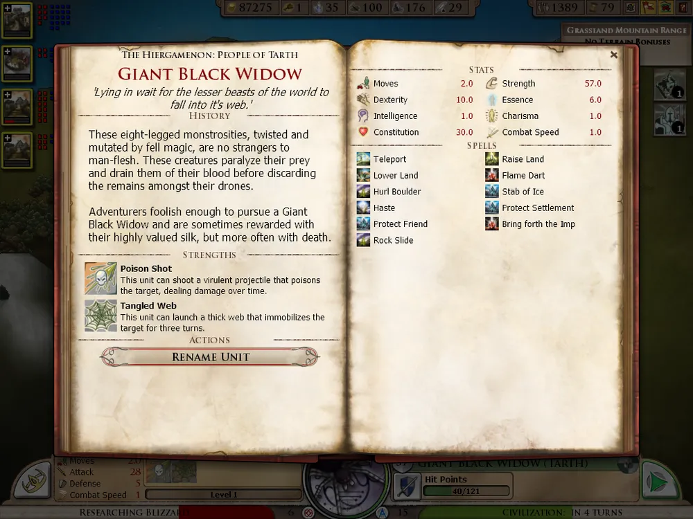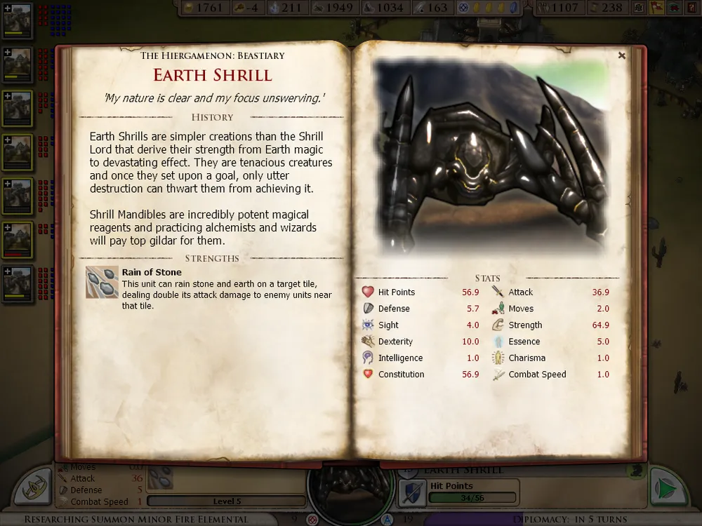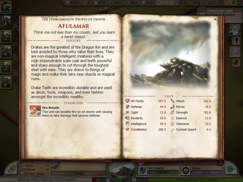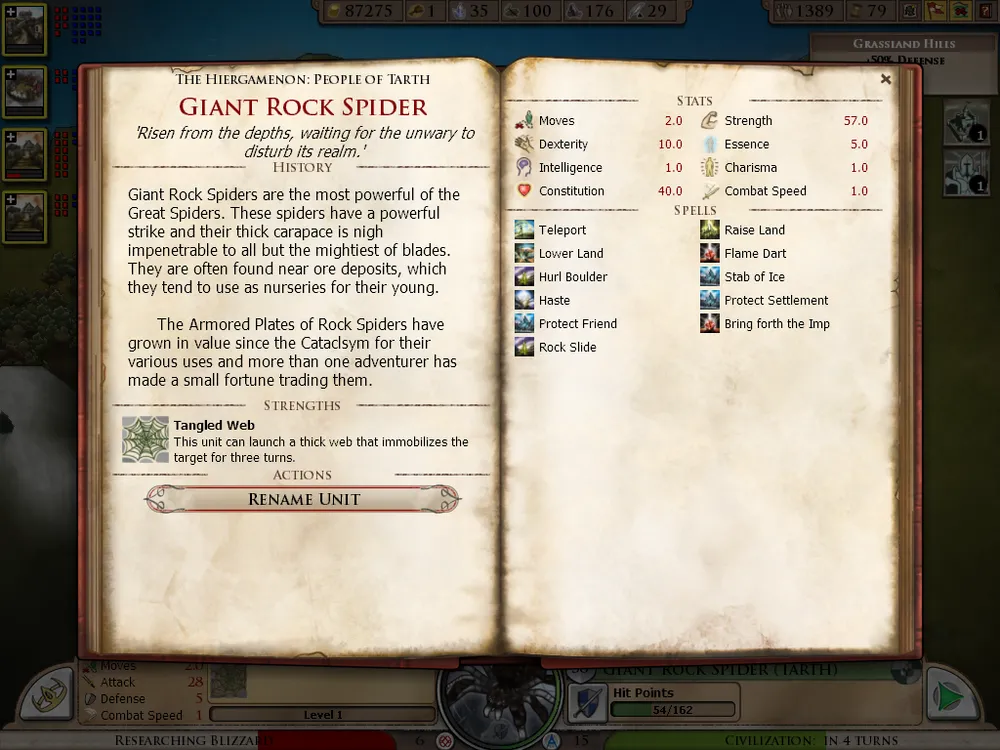 Очень интересная у него способность защищаться от атакующих заклинаний, правда магические умения по нему бьют (огненное дыхание на пример). Так же стоит отметить, что иногда за место представленного на картинке попадается урезанный вариант, который не имея двух особых способностей оценивается всего на 4 очка ниже, что явно свидетельствует о том что очки по большей части не качественный, а количественный показатель, так как в тактическом бою такие умения явно дороже чем просто пара ХП. В общем смотреть на очки рейтинга не всегда стоит, что очень сильно напоминает - "У диабло понтов было много, а боец он никакой... Зарезал я его как свинью, заработал много експирианса и получил левел ап" (с). Я лично побеждал армии в тактическом бою превосходящие по очкам меня в два раза (при почти равном количестве юнитов).