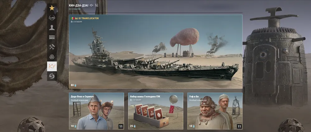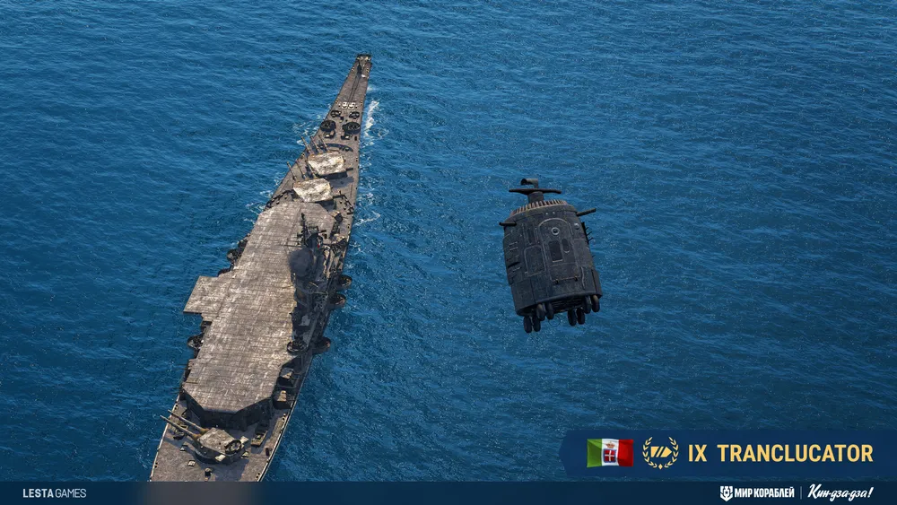 За «КЦ» игроки смогут получить и новый гибридный линкор IX уровня Tranclucator в тематическом постоянном камуфляже, превращающий корабль в одну из достопримечательностей галактики Кин-дза-дза. Помимо антуражного внешнего вида, классические самолеты будут заменены на пепелацы.