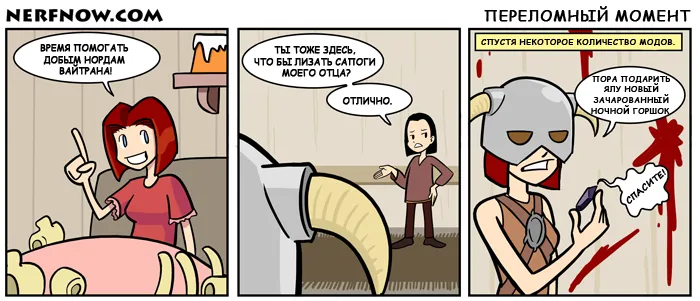 Автор Nerfnow совершенно точно стал фанатом новой игры. Больше комиксов одной тематики имеет только его родная серия о TF2 и SC2. Более ранние комиксы Nerfnow о Скайриме в предыдущем посте.