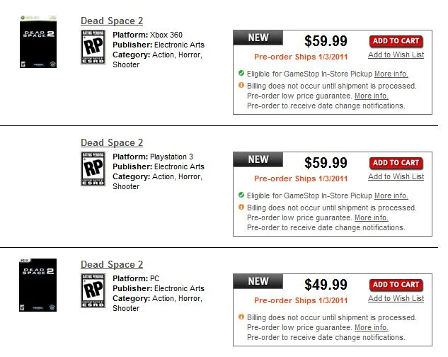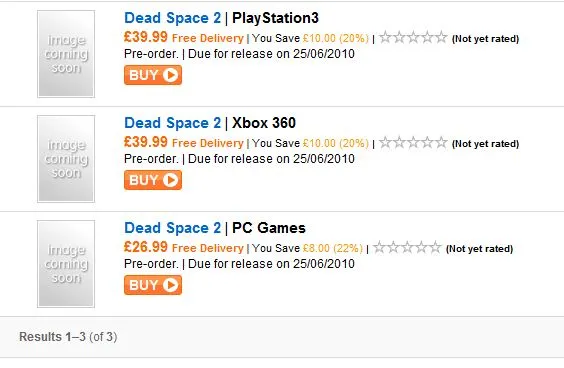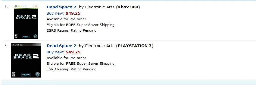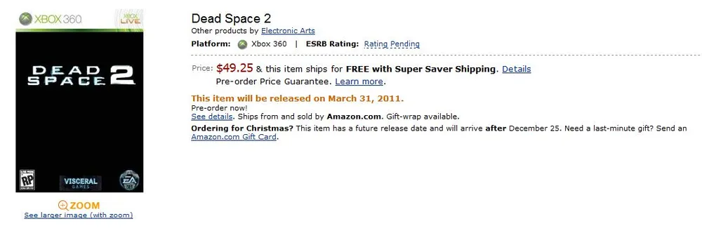 Пойдем дальше, знаменитый магазин amazon.com тоже включил игру Dead Space 2, в списки предзаказов. Правда почему-то исключил ПК версию. Ну да ладно. А как же дата? Март 31, 2011.