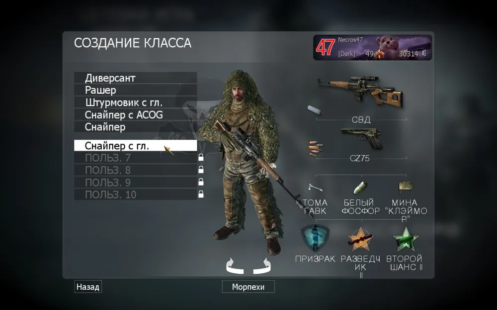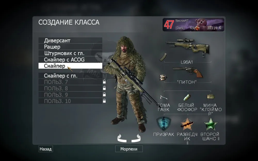 Итак, мы играем снайпером - следовательно наша задача: занимать удобную для нас позицию, прикрывать наиболее вероятное место появления противника со спины миной, затем спокойно вести отстрел вражеских тушек.