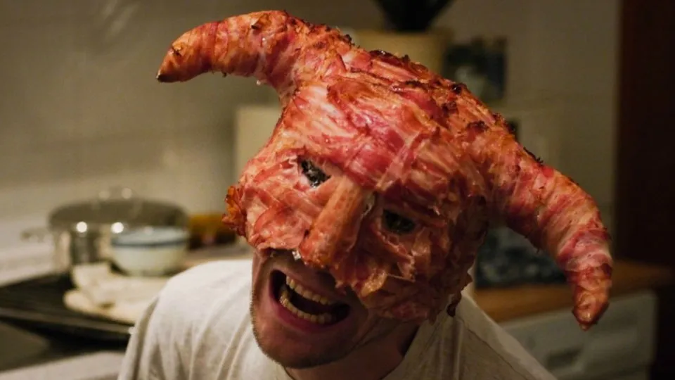 Из фольги делаем каркас шлема Довакина, на который потом лепим кусочки бекона. Получится что-то подобное: