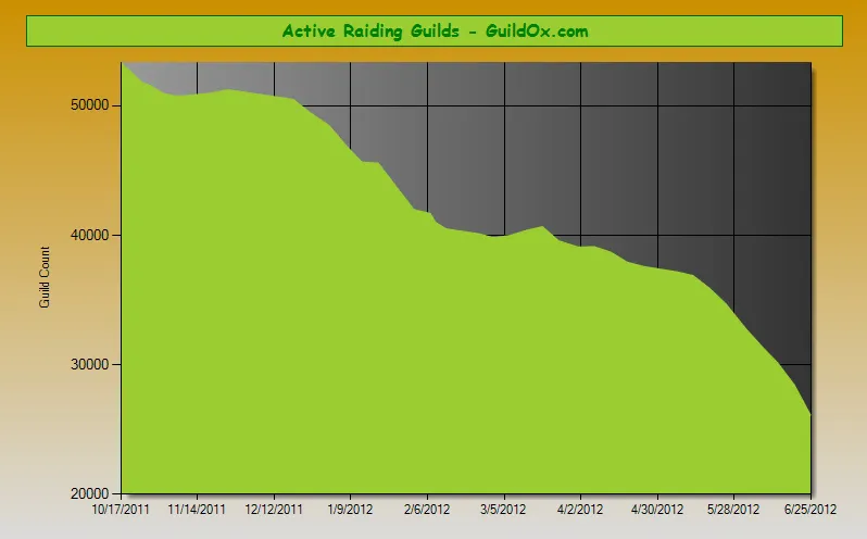 Сайт GuildOx, собирающий статистику World of Warcraft из открытого источника (официальной базы данных WowArmory), опубликовал любопытный график. На оси OX — даты, на оси OY — количество гильдий, ходящих в рейды. По графику видно, что WoW-рейдингу сильный удар нанесла Diablo III: кривая после середины мая резко ныряет вниз. Снижение количества гильдий, ходящих в рейды, менее чем за полтора месяца после релиза Diablo III составило приблизительно 40%; на такую же долю оно снизилось за пять с лишним месяцев между релизами Cataclysm и Diablo III.