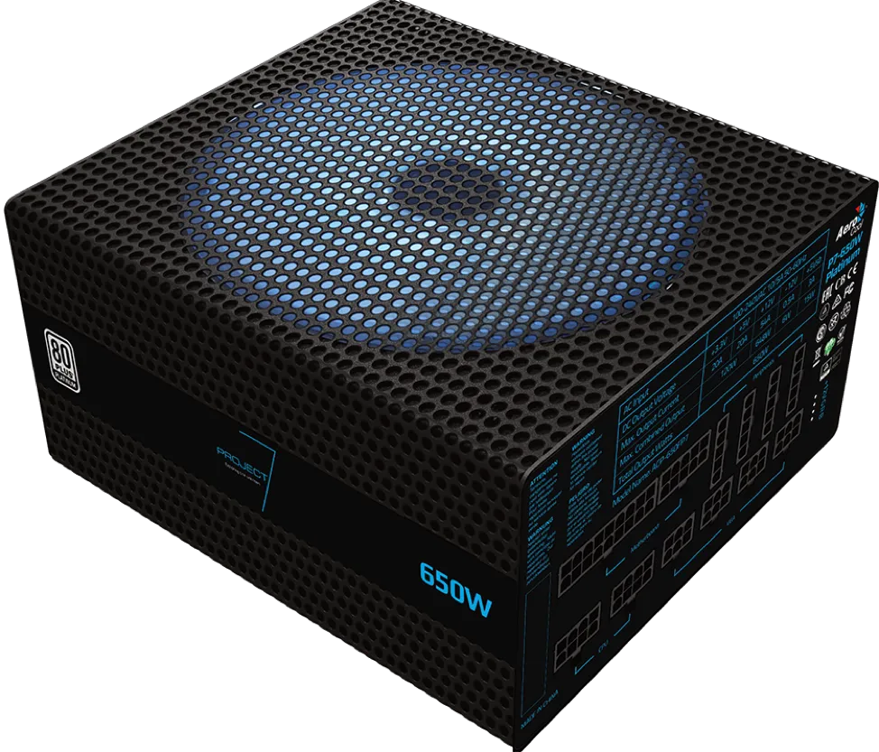 AeroCool P7-650W Platinum является как раз такой золотой серединой. Блок получил топовый сертификат 80Plus Platinum, означающий КПД до 94%. За надежность отвечают японские конденсаторы, свободная компоновка с обилием пространства для обдува и 140-мм вентилятор с особым профилем лопастей и долговечным гидродинамическим подшипником.