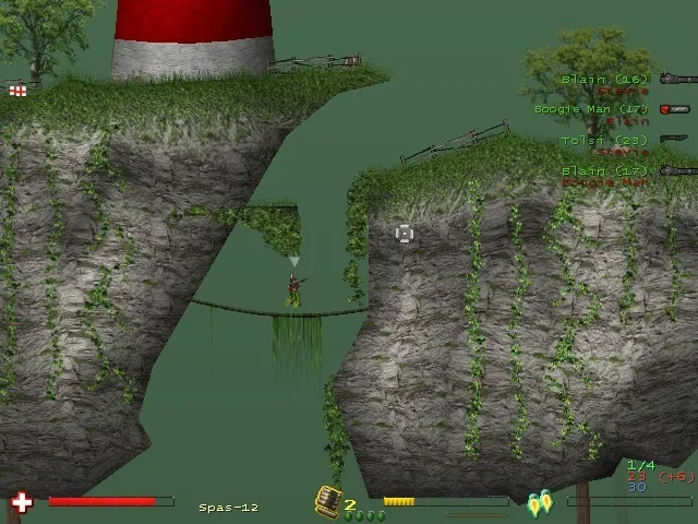 Не знаю как вам, но мне управление в Teeworlds кажется проще (или я уже привык к динамической камере), кнопок меньше задействовано. В Soldat-е больше различных действий, новичок о них даже не знает (например, можно лечь, бросить гранату, кувыркаться и т.п.) и на каждую приходится отдельная кнопка. Камера ходит за курсором мыши-прицелом, человечек иногда теряется. В обоих играх есть своя “фишка” передвижения. В Teeworlds это hook (хук, он же крюк) – цепочка с крюком, которая может цепляться за всё, что угодно (кроме специальных металлических плит в версии 0.5.2) и тянуть к себе (или себя к чему-либо), даже за других игроков, притягивая их к себе. В Soldat-е это ракетные ботинки, с помощью которых игрок может находиться в воздухе некоторое время (специальная полоска находится справа-снизу экрана). Провисев некоторое время в воздухе (около 5 секунд), необходимо приземлиться, чтобы полоса заряда ракетных ботинок восстановилась. С помощью крюка в Teeworlds опытные игроки могут развить очень большую скорость на карте, в Soldat-е чудо-кросовки скоростью не отличаются.
