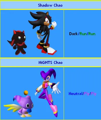 Некоторые склонности соответствуют внешности определённых персонажей. Например Тёмный бегающий+бегающий Чао похож на Шэдоу, а Нейтральный летающий+летающий на Найтса из Nights into Dreams.