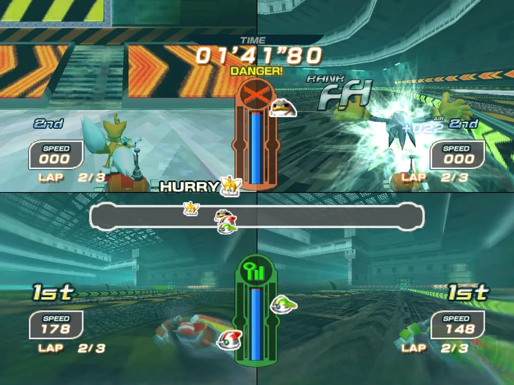 Что касается гоночных режимов, то помимо стандартных гонок, гран-при и свободных заездов в игре есть ещё три. В режиме связки (Tag mode) соревнуются две команды, по два игрока. У команды общий бак воздуха, а кроме того игроки не должны сильно удалятся друг от друга на трассе (иначе удар током). Боевой режим выживания проходит на специальных аренах, где надо таранить других участников в режиме ускорения. И наконец, при игре в гоночном режиме выживания, надо подобрать лежащий на трассе Изумруд Хаоса и проехать с ним через трое ворот (тоже стоят на трассе). Причём надо помнить, что Изумруд всего один и при атаке его отнимают. Увы, но выбирать снаряжение можно лишь в стандартных режимах.