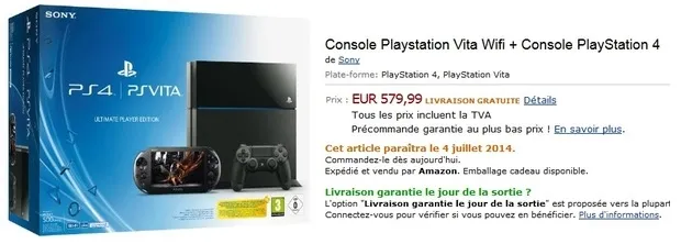Sony анонсировала "новую" игровую приставку Sony Playstasion 4 в комплекте с которой имеется игровая портативная консоль PS Vita. Данный комплект получил название PS4: Ultimate Player Edition и уже доступен в продаже (предварительный заказ) на европейских ресурсах, в частности на сайте Amazon France по цене 579,99 EUR и доставлять ее начнут с 4-го Июля 2014 г. с дня официальных продаж. Когда сие чудо появится в России и сколько будет стоить пока не известно.