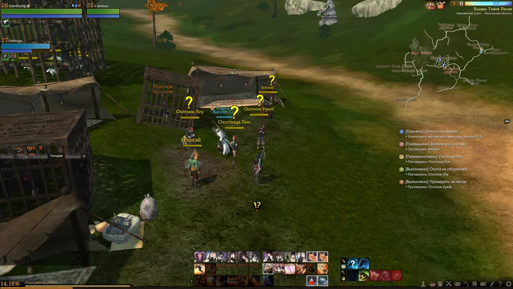 Поскольку вся мякотка игры — в high-end контенте (плюшках, становящихся доступными только по достижении максимального уровня), целью становится не узнать историю каждого камня в кладке мостовой, а побыстрее прокачаться до потолка. И делать это лучше, как и всегда, в группе. Будет ли это просто партия на 2-3 носа, конст-пати (именуется здесь «семьей») на три десятка тел или рейдовая группа на всю локацию — убитый квестовый моб будет засчитываться каждому, у кого активно конкретное задание, и каждый член группы сможет персонально полутать трупик. Не стоит удивляться, если с одного оленя в итоге упадет 15 пар рогов. Печалит здесь лишь то, что квестовые предметы все равно приходится каждый раз подбирать самостоятельно, ибо зачитываются они только индивидуально. Но так обычно везде.