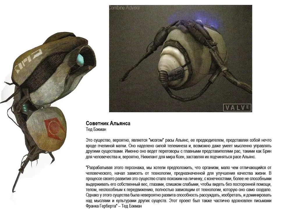 В книге Half-Life 2: Raising the Bar дизайнер игры Тед Бэкман упоминает, что на огромную, червеобразную форму Советника его вдохновили образы в творчестве Фрэнка Герберта — Навигаторы Гильдии Спайса и Лето Атреидес II из книг о Дюне.