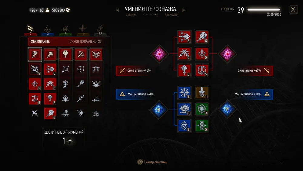 В красную ветку бросаться не стоит, это несильно поможет на первых этапах игры. (Хотя можно раскидывать так, как удобней: сначала пару умений на удары и пару на Знаков, прям критичного ничего тут нет.)