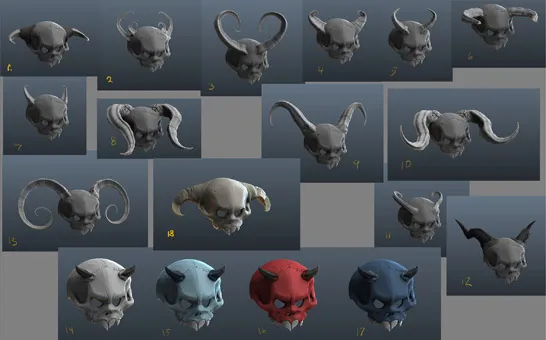 На этом этапе я решил что череп будет выглядеть круче, если я добавлю к нему рога. Я сделал несколько вариантов и отослал своей команде, чтобы выяснить, какой из них станет всеобщим любимцем.