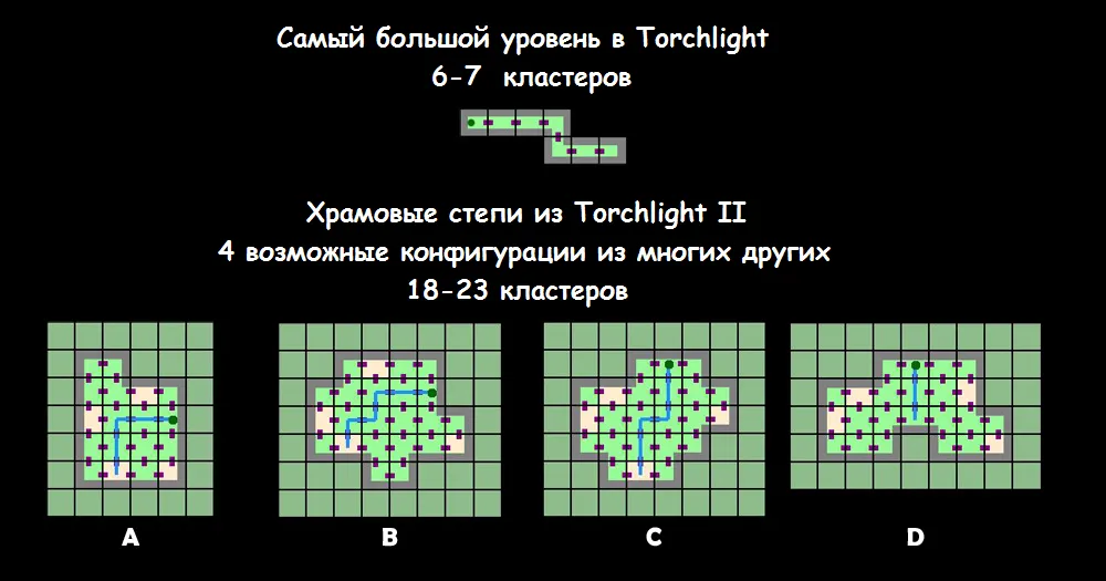 Давайте теперь взглянем на Открытые локации. Открытые локации заметно больше, шире и их можно полностью исследовать. Как только вы в нее войдете, вы можете идти в любом направлении. Это большие игровые зоны Torchlgiht II. Игроки могут потратить много времени просто на исследование всего и нахождение маленьких сюрпризов. Они также сильно рандомизируются, как и подземелья, поэтому вариантов - бесчисленное множество. Чтобы представить себе размеры этих зон, сделаем сравнение с первой частью. Самые большие уровни в Torchlight I были в конце игры в "Черных хоромах". Самый большой уровень был размером в 6-7 кластеров и очень линеен. Открытая локация в Torchlight II может иметь до 23 кластеров.