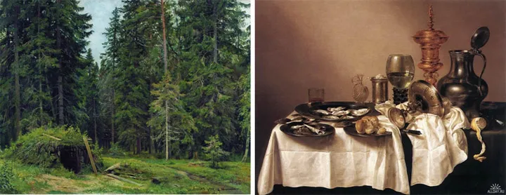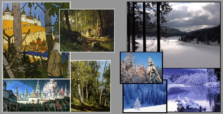 Любую натуральную, а зачастую и искусственную, структуру объектов, можно представить в виде масштабной сетки. Правдоподобность любого пейзажа или натюрморта, достигается компоновкой очень крупных , средних и мелких объектов. Композиция построенная на разномасштабных формах всегда несет эстетическое удовольствие.