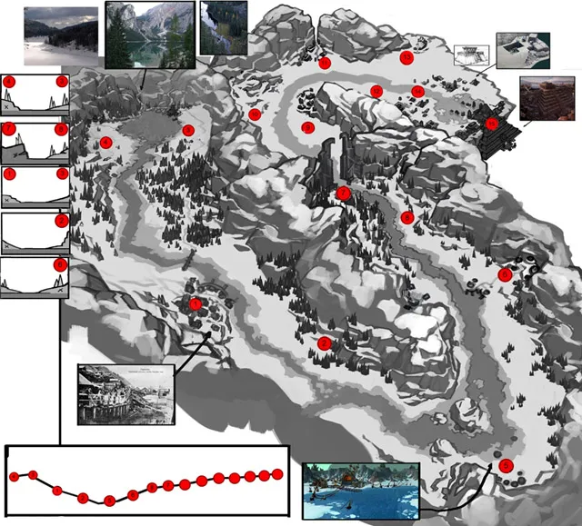 Общая топологическая болванка это реализованный в редакторе топологический скетч. На этой стадии работы я могу побегать по всей зоне целиком и проверить, подходят ли все пропорции под нужный тип геймплея. C помощью выдавливания глобальных перепадов высот легко понять, правильно ли мы направляем игрока, в каких местах сконцентрировано его внимание, соответствует ли изменение высот ландшафта прототипу и т.д.