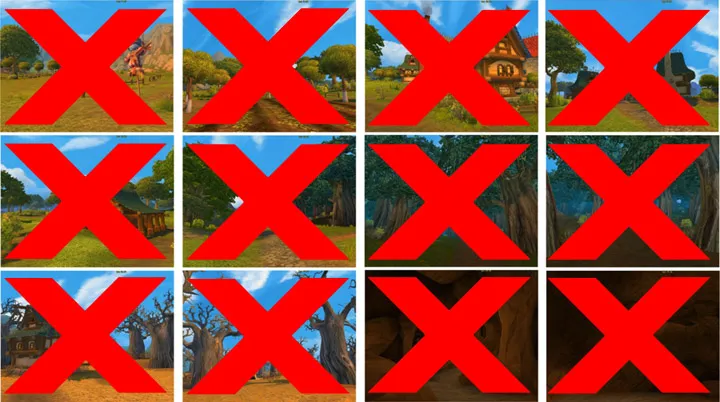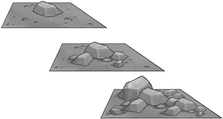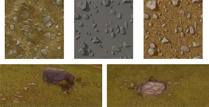 Проходимые куски должны иметь меньшею контрастность и дробность в рисунке, чем непроходимые. Количество и насыщенность черного у непроходимых участков террейна и обжей закрывающих путь должно быть больше, чем у площадок, по которым игрок свободно перемещаться. Это нужно для более интуитивного движения по всей зоне в целом.