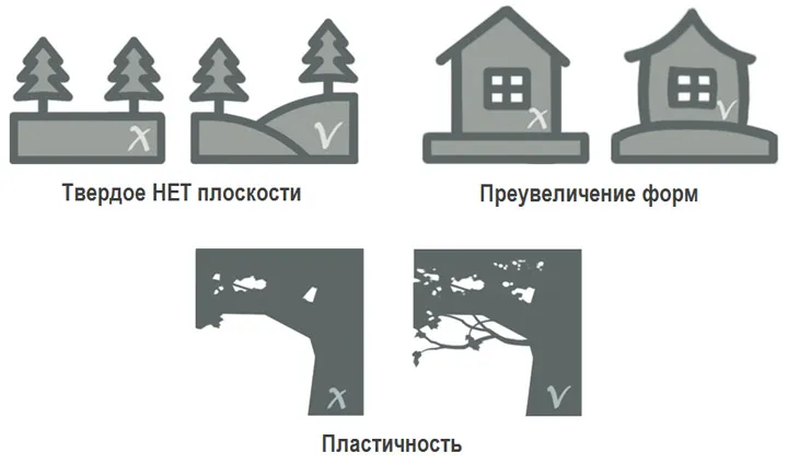 Необходимо стремится к тому, чтобы контур объектов и деталей были максимально пластичными и насыщенными. Стараться скрыть угловатость лимитированной геометрии. Необходимо следить за тем, чтобы следование этому правилу не нарушало читаемости форм. Окружение не должно ставить игрока в тупик. Оно должно его удивлять и поражать, при этом оставаться понятным.