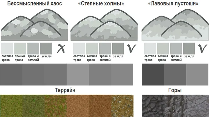 Так мы получаем отдельные линейки талов для поверхности, где перемещается персонаж и для срезов террейна – горных массивов. В каждой из них есть темные тона для углублений, средние для основы и светлые для выступающих поверхностей.