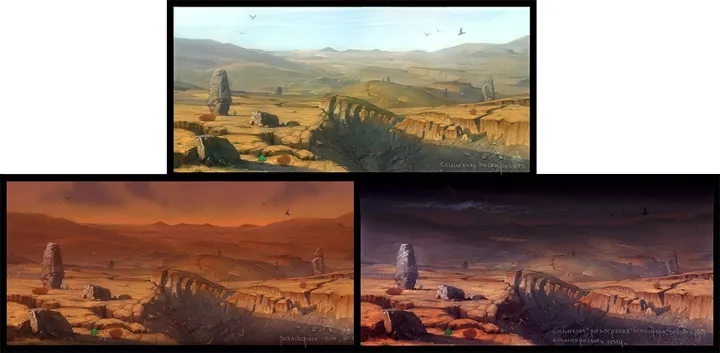 В процессе работы над атмосферным скетчем, необходимо всегда держать в голове, что вы рисуете игровой кадр. Кроме наличия в нем всех характерных объектов, и композиций выстроенных из них, важно, чтобы композиция была максимально характерной именно для всей зоны в целом. Например, рисуя концепт зоны, где главной топологической «фишкой» является река окруженная горами, не стоит тратить время на вырисовывание поселка построенного где-то на отшибе.