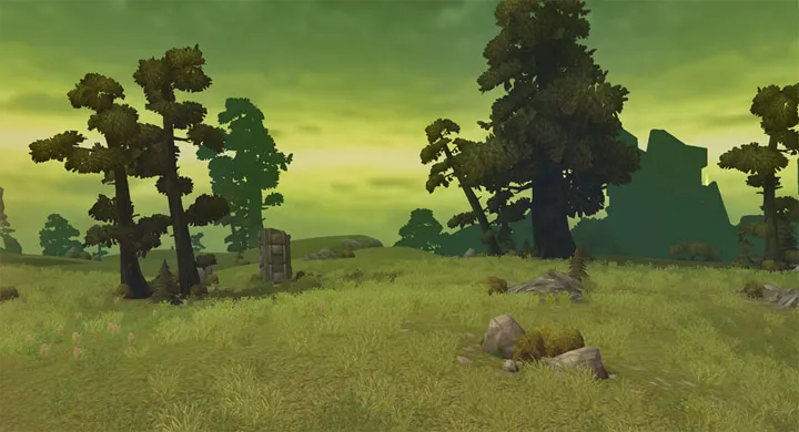 На горизонте мы видим наиболее габаритный объект, затем в сетке масштабов идут сосны, потом расставленные вокруг них для поддержки небольшие ели и руины, затем мелкие камешки и последний рейндж – это трава, которая тоже разбивается на несколько типов по форме и размеру. Каждый объект имеет свою нишу по высоте, ничто друг с другом не спорит- все смотрится очень органично.