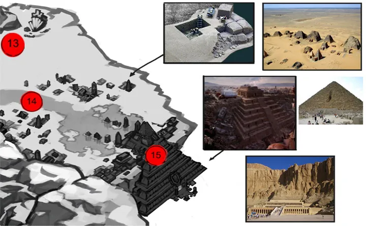 Например, на этой зоне, финальный сектор посвящен похороненной в земле пирамиде загадочной древней расы. Тэги для поиска рефернсов для этого места были следующие: древнее зло, раскопки захоронений, загадочные египетские храмы.