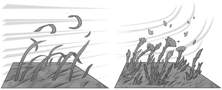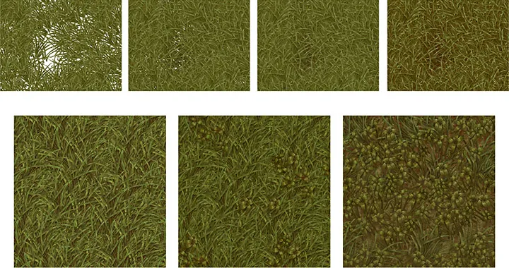 Для максимальной эффективности процесса необходимо представить себе покрытие как маленькую 3D схему или кубик, все составляющие которого имеют единый рисунок и пластику: Рисунок тайла пересекается с рисунком растительности, а она в свою очередь взаимодействует со средой через частицы уносимые ветром. При этом и рисунок линий травы на тайле и спрайтов травы совпадают.
