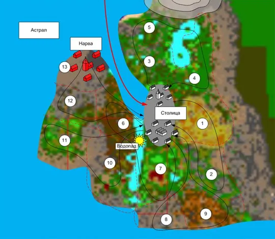 Итак, у нас есть атмосферный скетч, и есть концепты всех тиражируемых по зоне объектов. Аутсорс старательно воплощает их в жизнь, однако мап-дизайнеры сидят без дела . Общего концепта зоны им недостаточно. Для помощи, и для гарантии целостности зоны относительно заданной темы зоны, мы используем топологические скетчи: