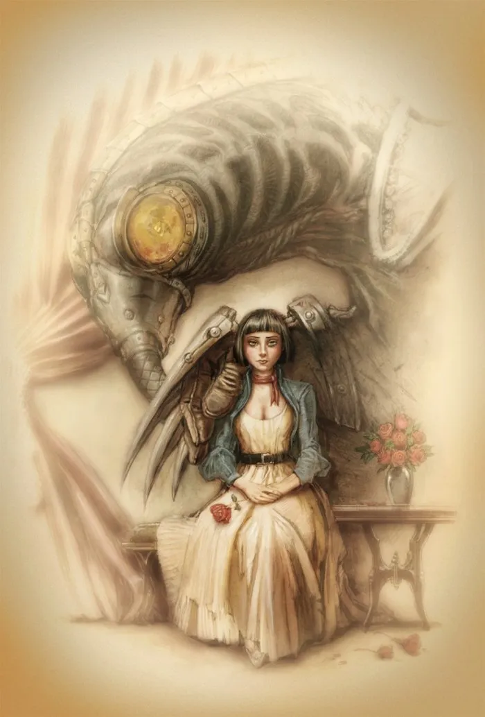 Кен Левин: Создание двух персонажей заняло больше всего времени. Это были Элизабет и Птица. Их разработка прошла через множество этапов. С Элизабет всё было более понятно. Она всегда была молодой девушкой, и мы работали с разными вариациями на эту тему и с её стилем. Со временем она стала выглядеть по-другому, но вот Птица была чем-то вроде, «окей, что это, чёрт возьми, за штука такая?» Мы даже не знали, какое у Него имя, мы просто знали о Его силе в этом мире.
