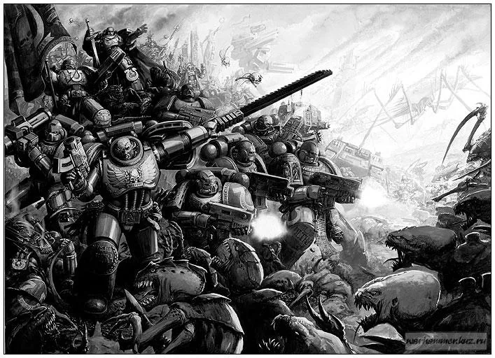 Рев штурмовых болтеров заглушал боевой клич ветеранов первой роты Ультрадесанта, обрушивших праведную ярость на мерзкую расу тиранидов. Перед братом Рием появился визжащий гормагонт с жуткой длинной головой, брызжущий слюной из клыкастой пасти. Рий отработанным движением развернул оружие в сторону твари. С угрюмым удовлетворением он наблюдал через щиток шлема, как уродливое создание разрывало на куски. От отдачи штурмовой болтер дернулся в руке, и череп твари взорвался брызгами лиловой крови и осколками костей.