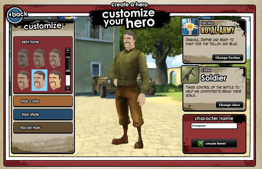 Главная особенность Battlefield Heroes — персонажи. Теперь каждый боец — личность, а не просто очередной болтик в большой военной машине победы (как в BF1942 или 2142). Собственно, приставка Heroes и характеризует игру. Мы можем выбрать, как будет выглядеть наш подопечный, во что он будет одет, кем станет… но для начала выберем сторону.