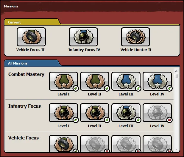 Медальки-нашивки вписаны в игру очень органично. Это как бы мини-миссии. Так, например, Combat Mastery выдается за полученные очки и убийства. Infantry Focus зачитывает урон по пехоте (исправлено: в роли пехоты, конечно же) и фраги за раунд, а Vehicle Hunter — награда умелым водителям танков.