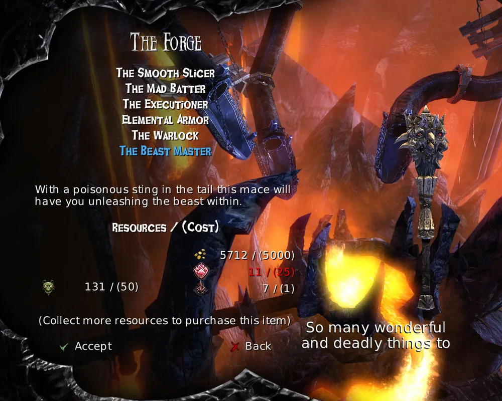 Механика ремесла в Overlord 2 гораздо проще. Вещи здесь нельзя настраивать по параметрам, скармливая печке разные виды чертенят. У каждого предмета есть фиксированная цена в жизненной силе, золоте и кристаллах. С одной стороны стало меньше возможностей для настройки, а с другой вещи получили хоть какую-то индивидуальность. В первой части зачарованный предмет отличался от другого только максимальным зарядом жизненной энергии, здесь волшебный клинок возвращает ману после убийства, двуручный топор наносит больше урона при круговом ударе, а дубина с ядовитыми шипами вызывает тошноту, слабость и диарею.