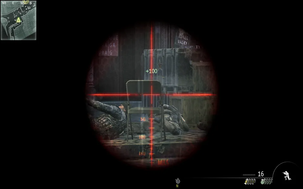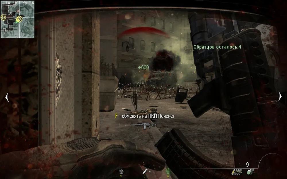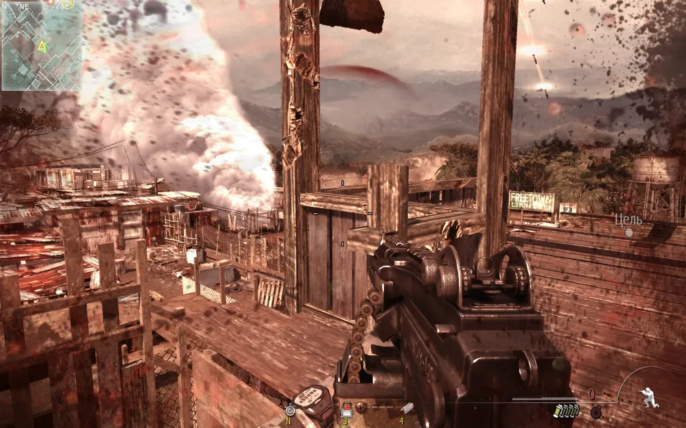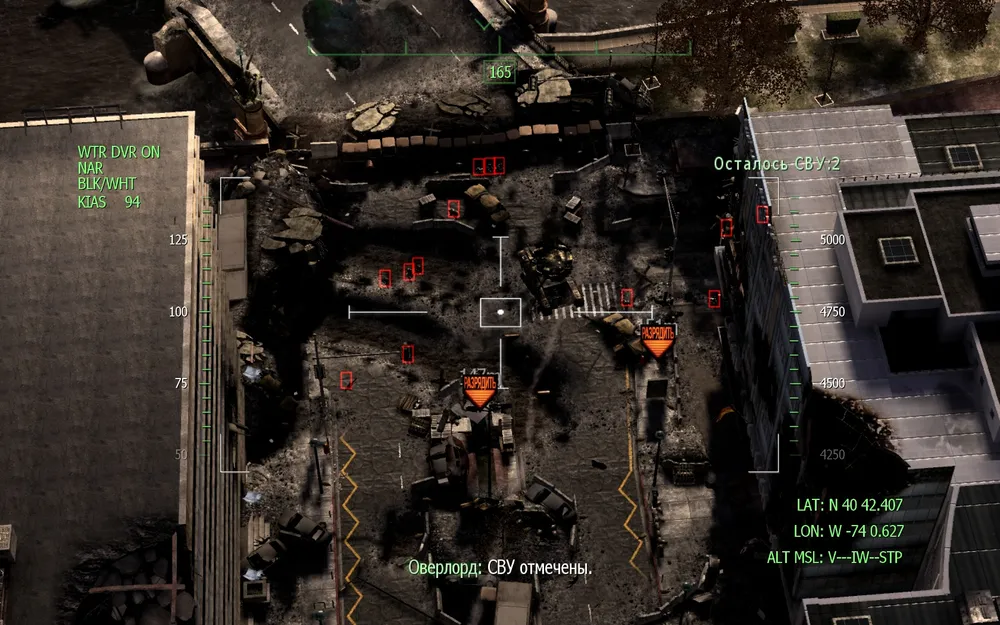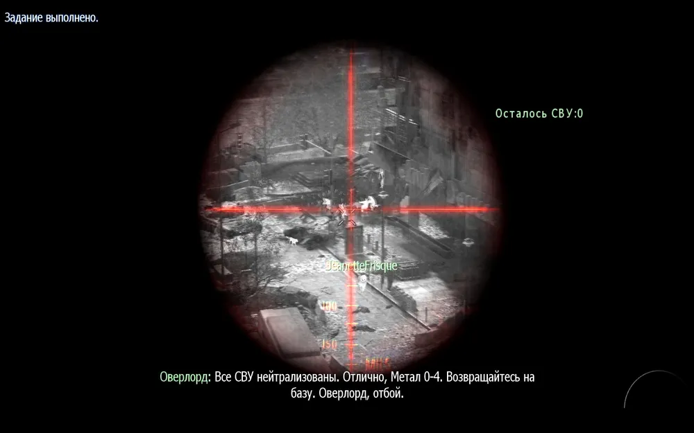 После зачистки площади, переходите к улице. Там тоже есть турели, одна в конце улицы справа за деревянным забором, а вторая там же, но чуть ближе, на крыше слева. После сбора всех документов нужно идти к трубе. Осторожно, на одной из крыш справа будет турель. Проходите по трубе, забираетесь на вышку и после того, как вам дадут лазерный целеуказатель, наводитесь на цели, ждете пару секунд и жмете кнопку стрельбы. Бомбардировка уничтожает цели, а вы побеждаете.
