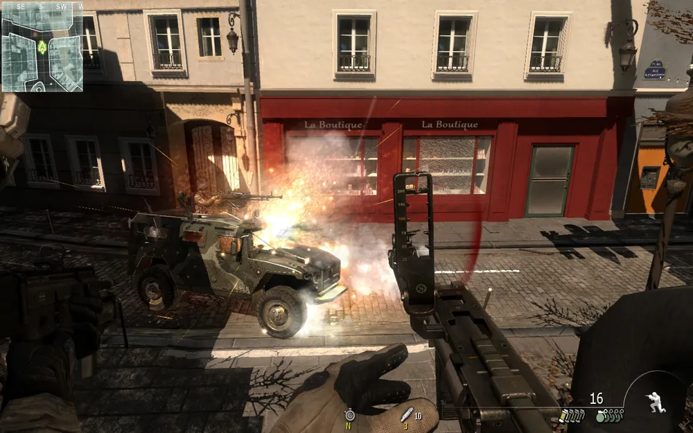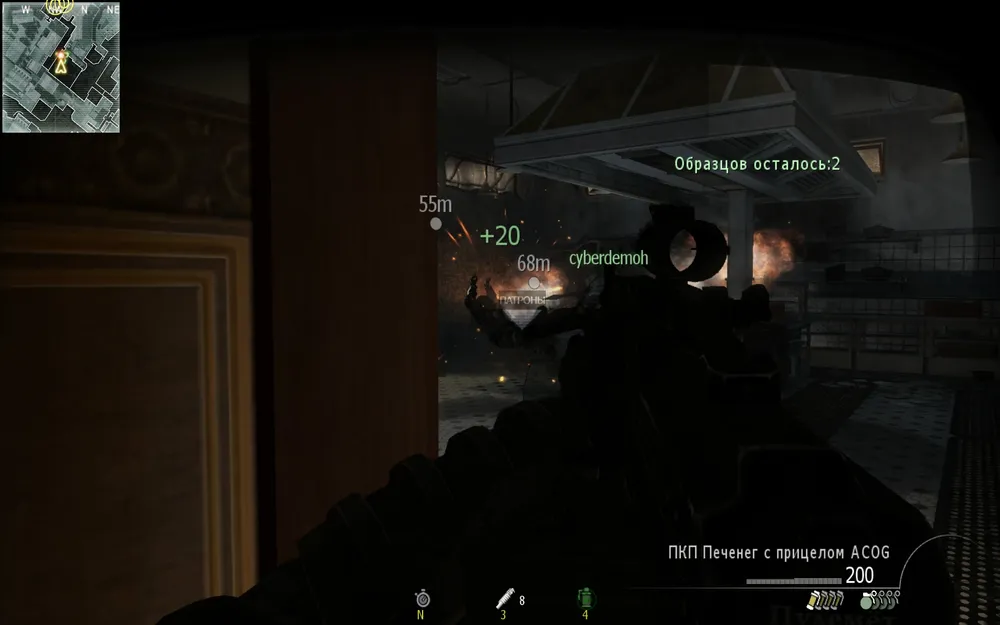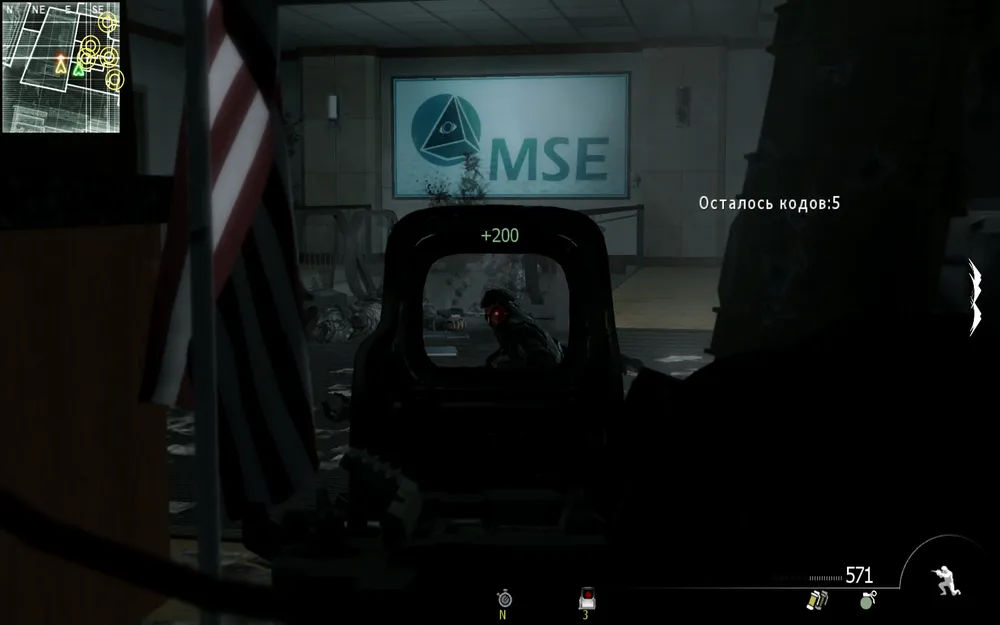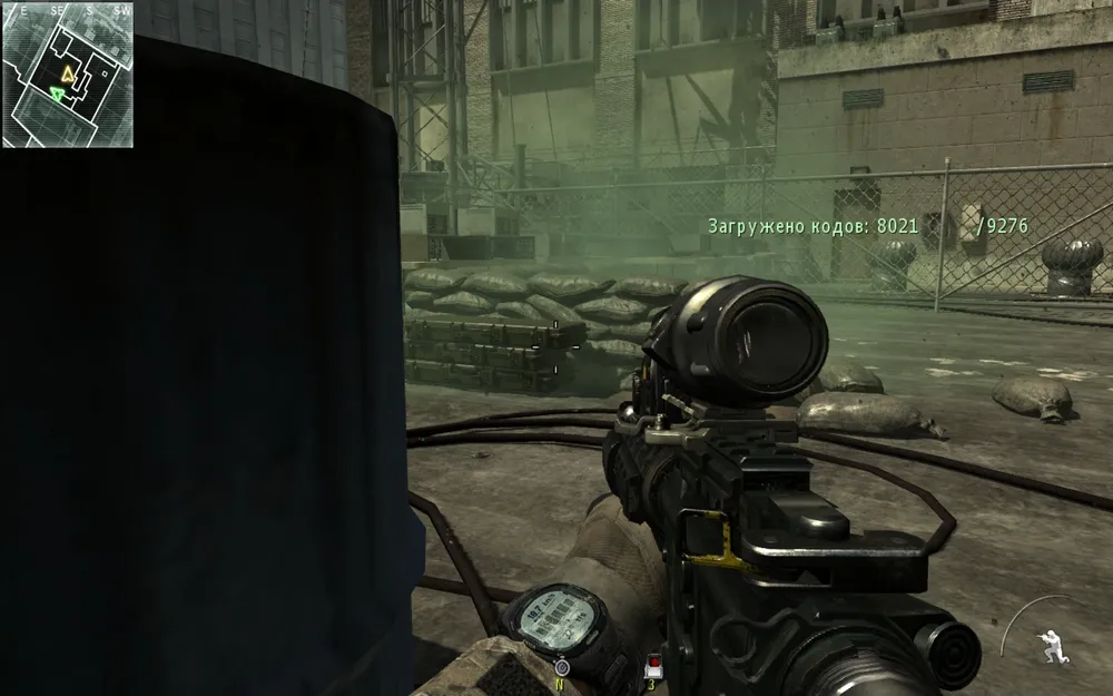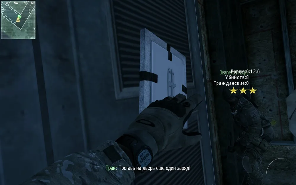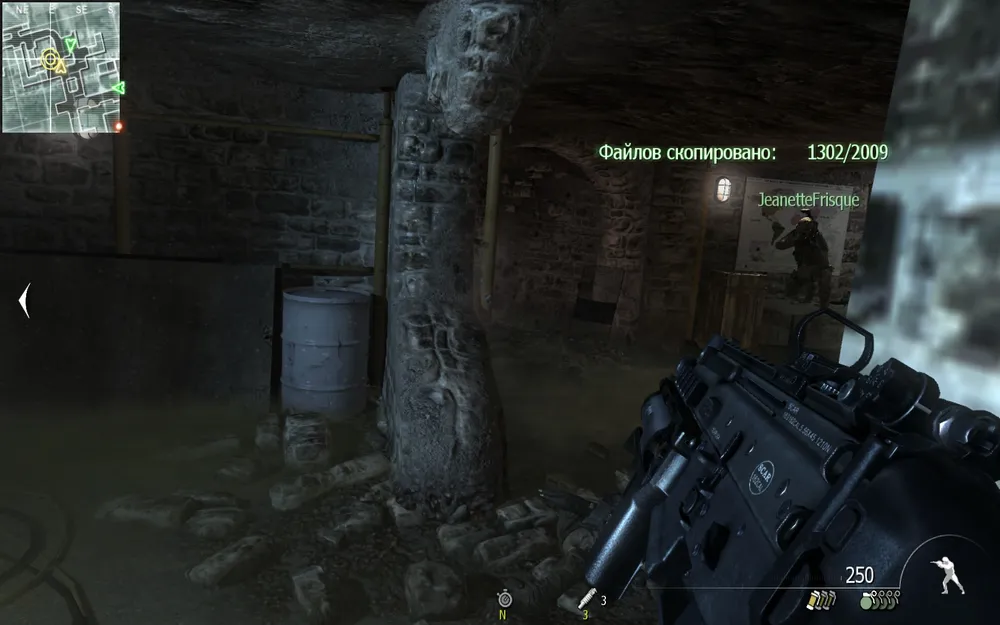 Обставьте все «клейморами» и начинайте копирование файлов. Можно сесть в углах стенки напротив, тогда оба тоннеля можно держать. Или один садится на стол, а второй — за другой стол (на одном из скриншотов). Осторожно, будут враги со щитами. После завершения скачки вам нужно вернуться тем же маршрутом к джипу. У нас джаггер был в тоннеле, но вспоминая опыт MW2, не знаю, всегда ли он там. Флешки, осколочные гранаты, заряды для подствольника — уничтожается как обычно. На улице будет полно врагов, отстреливайте их из дома. Как сядете в машину и поедете, миссия будет завершена.