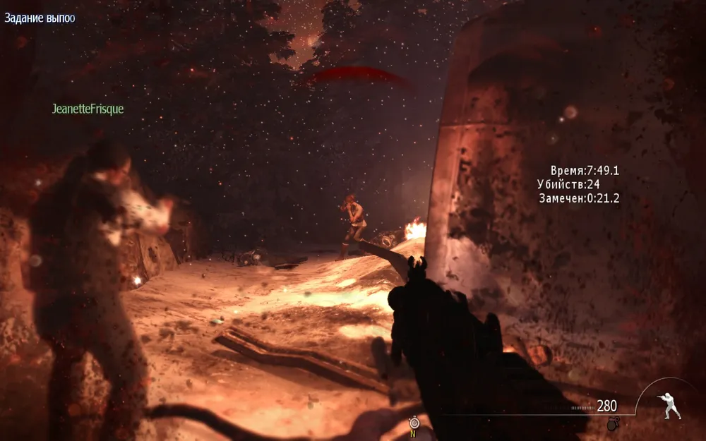 Опять же, счетчики для понта (и очков), для трех звезд нужно просто дойти до конца на «ветеране». Отстреливайте врагов, лучше стелсово. Хотя их конечное число, но есть те, которые появляются, если поднимется тревога. По пути можете спасать заложников, они светятся темно-красным, если вдруг не заметите так. После того, как перелезете через забор, ближайший чекпоинт — точка эвакуации. По пути я насчитал пять заложников.