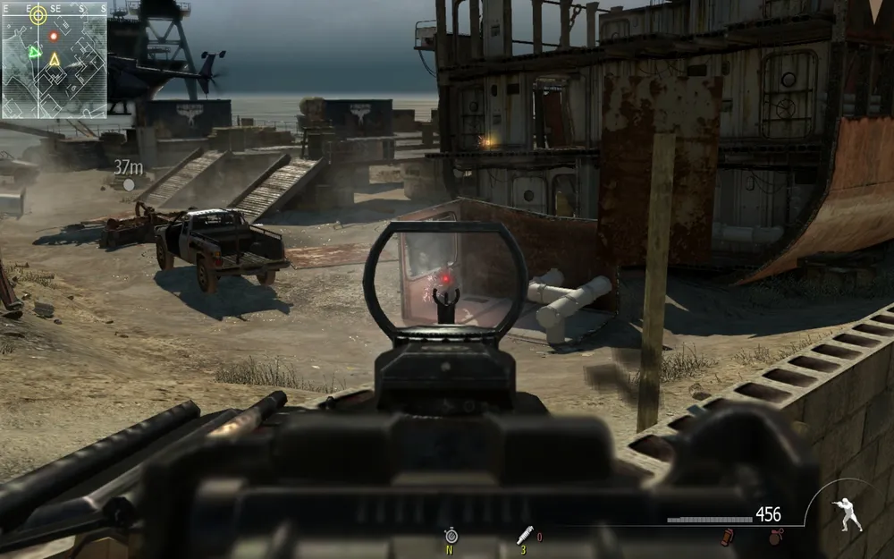 Сначала вы летите на вертолете в качестве стрелков-пассажиров. Тут задача сводится к своевременному отстрелу врагов. Прятаться вам негде, так что поможет только меткая стрельба, изучение маршрута и забрежка мест появления врагов. Когда вы будете подлетать к тому контейнеру, где в «Налете» были заложники (у моря), выбрасывайте в сторону джипа и рядом все или хотя бы большинство гранат (начав с осколочных и заканчивая световыми). Как только можно будет, сразу спрыгивайте и прячьтесь за контейнером (можно сначала за катушками). Теперь один расстреливает врагов, пока второй его периодически поднимает. Подавив сопротивление, идите к левой цели. Один игрок методично зачищает местность, пока второй прячется неподалеку (обязательное условие) на всякий случай. После уничтожения левой повторяйте тот же финт с правой. Можете ее сразу не уничтожать, а отступить примерно к контейнерам, у которых высадились, после чего уничтожить. Как только прилетит вертолет, подойдите к нему. Победа. Условие трех звезд то же — «ветеран».