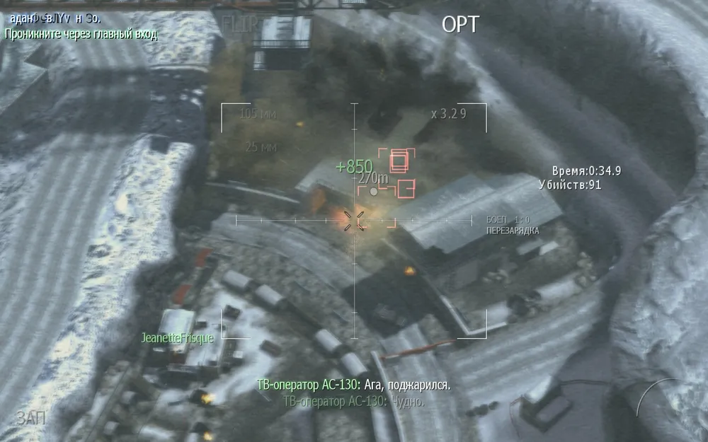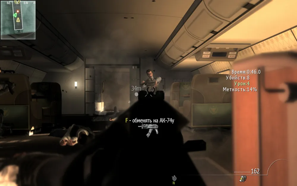 Вроде как стелсовая миссия. Поначалу действительно лучше действовать скрытно, да и веселее это. Но обязательно подберите с врагов АК-74у, пригодится. Продвигайтесь, уничтожайте врагов. Есть одна действенная тактика, если вас обнаружили: один остается отстреливаться, второй бежит и прячется в леса, убив преследователей, если таковые есть. Через какое-то время вас перестанут искать (либо просто, либо враги кончатся), и вы сможете поднять напарника (если он ранен). Так проходится весь уровень, а в конце вас ждет слоу-мо (перед ним, кстати, в траншее, образовавшейся при падении самолета, будут враги). Три противника, одна заложница, два игрока и замедление. Результат очевиден.