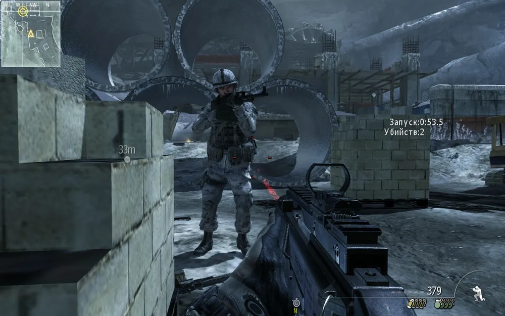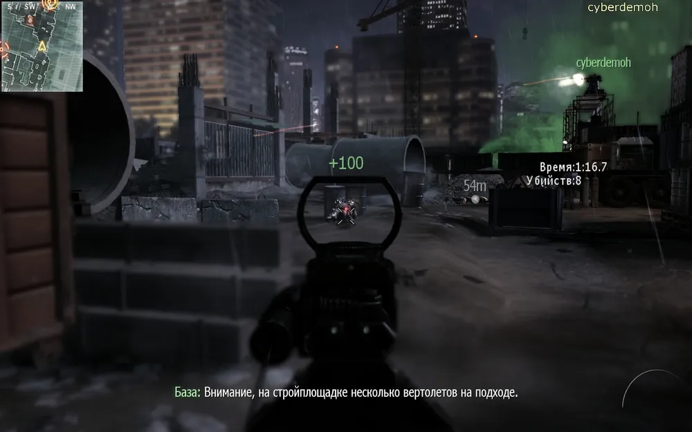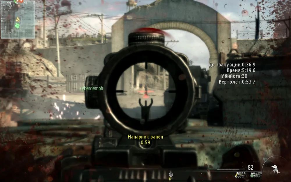 Один сидит на камерах и управляет пулеметными турелями (не забывайте переключаться между ними), а второй идет вперед и дает первому доступ к следующим. В общем, проблема только в том, что на прохождение миссии на «ветеране» у вас всего четыре минуты, поэтому оба игрока должны действовать быстро. «Пулеметчик» зачищает территорию, после чего туда под его же прикрытием суется второй. Что касается контрольных точек: через 1:05 (2:55 на таймере) мы были на верхнем этаже здания, после чего пулеметчик уничтожил оба вертолета. Еще через 1:20 (таймер — 1:35) уже бежали к стройке. Напарник сбивает два вертолета, после чего вам остается только пробежать меньше сотни метров до зеленого дыма, пристрелив нескольких врагов. У нас осталось 25 секунд в запасе.
