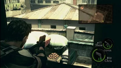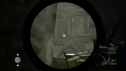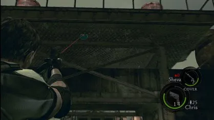 5) Когда вы окажитесь в здании, парадная дверь которого закрыта на замок с обратной стороны, вам нужно будет подняться на самый верхний этаж. Поднявшись, подойдите к тому месту, где можно помочь Шеве перепрыгнуть на противоположное здание. Если вы играете в одиночном режиме за Криса, то пока не делайте этого. Развернитесь и посмотрите наверх. На одной из бетонных развалин этажа лежит пятая эмблема BSAA. С этого ракурса, её плохо видно, но уничтожить всё равно можно. Если вы играете вдвоём, или в одиночном режиме за Шеву, то помогите девушке перепрыгнуть на другое здание. Как только она это сделает, развернитесь и посмотрите на это же место. Отсюда пятую эмблему BSAA видно гораздо лучше.