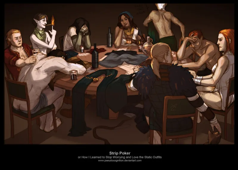 За отсутствием крупных скриншотов я решила украсить пост замечательным фан-артом госпожи pseudocognition, на нём все возможные(Бетанни/Карвер в том числе) компаньоны играют в покер на раздевание.