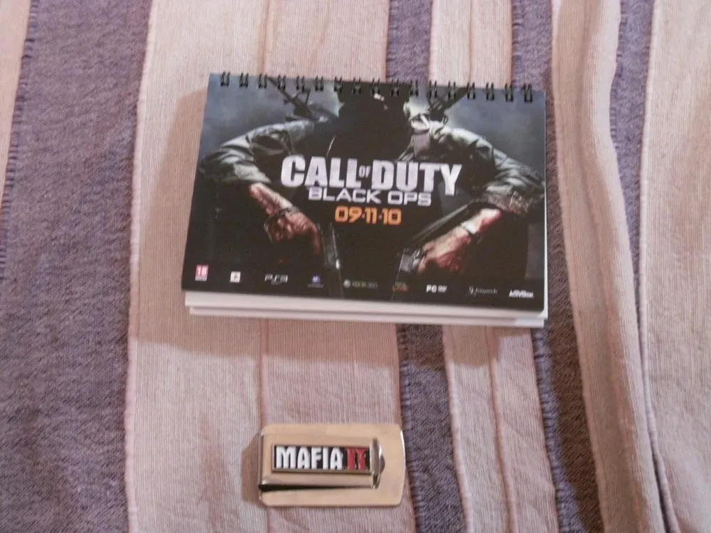 4) А теперь-самое интересное, что находилось в этих наборах: в Mafia 2 это превосходный зажим для денег с логотипом игры (он сделан из металла, не буду врать из какого, так как не знаю сам), в Call of Duty: Black Ops это ошеломительный (без сарказма) календарь на 2011 год (сам он выполнен из плотного картона, листы из плотной глянцевой бумаги, на каждый месяц написана памятная дата событий холодной войны и напечатан скриншот из игры). Итог тот же. По одному баллу у каждой игры.