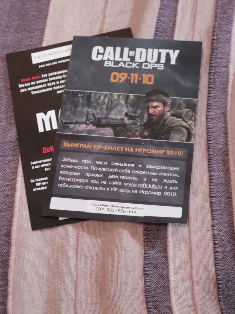 5) В обоих комплектах присутствуют купоны на розыгрыш. В Call of Duty: Black Ops это VIP билет на Игромир 2010 (я участвовал, но проиграл). В Mafia 2 это проход на вечеринку, посвященную этой игре (в этом розыгрыше со мной произошла такая история: я принял участие, однако за несколько дней до вечеринки, не узнав результатов, я уехала в отпуск в Тунис. Вернувшись, я проверил электронную почту, и наткнулся на письмо от 1С. Оказывается я выиграл конкурс, но поскольку вернулся уже тогда, когда вечеринка прошла, соответственно на нее не попал. Вот так то). По одному баллу каждому. Но, в Mafia 2 помимо розыгрыша, в комплекте также есть мини-DLC, а именно Vegas Pack, поэтому ей еще один балл.