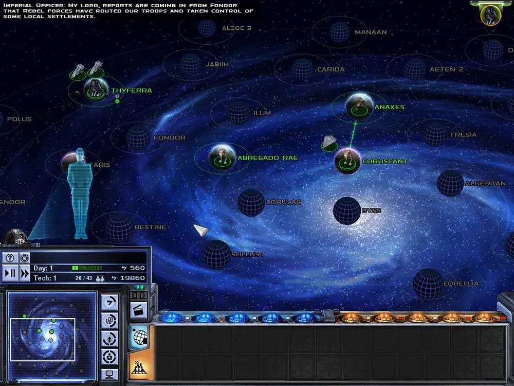 Итак, в чем состоит игра. Есть галактика, состоящая из планет. Каждой из 2 сторон (ай, нехорошо, могли бы еще каких-нибудь ордосов придумать!) подвластна часть этих планет. Планеты производят ресурсы, и около каждой из них может быть построена космическая станция, помогающая обороняться, если вдруг коварный враг нагрянет. Также на планетах можно построить заводы, выпускающие армию и флот. Разумеется, все они уникальны и отличаются максимально возможным уровнем орбитальной станции, количеством заводов на поверхности, своим вкладом в экономику и климатом. Построенный вами флот понадобится для того, чтобы отбивать атаки противника на звездные системы и нападать самому. А армия — для отпора врагу на земле, если ему все же удалось туда просочиться, и добиванию уже окопавшихся на земле недобитков.