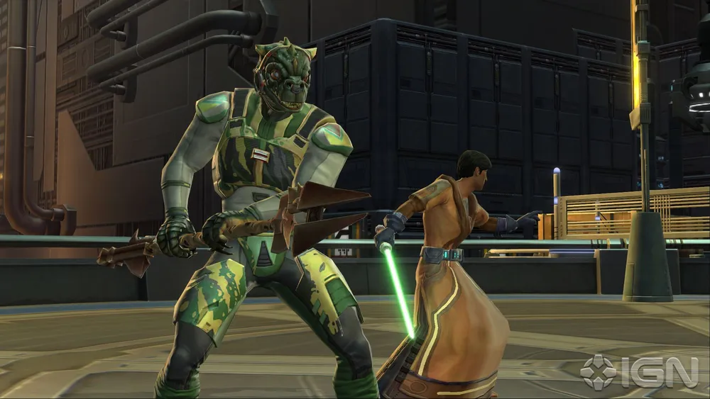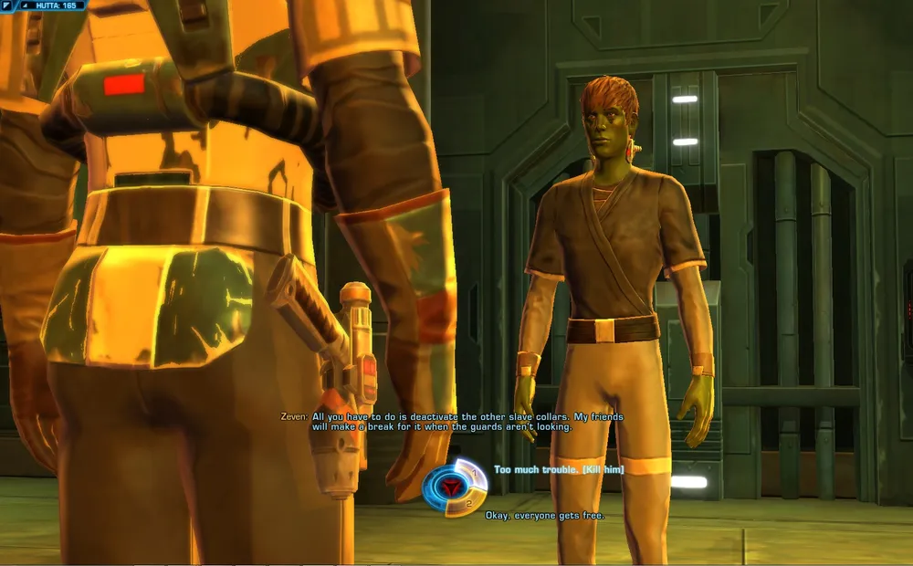 Если у вас есть друзья, обязательно тащите их в группу и вместе бегите на квесты. В SW:TOR есть замечательная возможность участвовать в диалогах всем сразу. Более того, за это вам будут начисляться социальные очки, которые тратятся на различные декоративные и не очень прибамбасы. В случае с групповыми диалогами отвечать будет тот, чей ролл больше. Соответственно и социальных очков ему(ей) даваться будет в два раза больше. Единственный незначительный минус всей этой системы – слегка «мертвая» озвучка. Нет, качество все равно впечатляет, но через сотню вот таких вот диалогов все постепенно начинает сливаться в одну длинную ноту. К разнообразию квестов и их типов не возникало претензий по большей части из-за интересных диалогов и неожиданных поворотов сюжета. Да, еще раз повторюсь – сюжет для игры такого жанра просто шикарный.