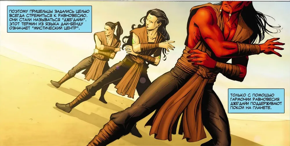 Star Wars Заря Джедаев рассказывает нам о первых людях, которые начали называть себя джедай’ами. Да, о тех самых сторонниках светлой стороны, верным спутником которых была светлая сторона силы. Действие комикса происходит за 25 000 лет до событий фильма. Восемь кораблей Йо-Торн разлетелись по разным уголкам вселенной, чтобы собрать разумных существ с разных планет, восприимчивых к могущественной энергии – Силе. И затем привезли их на отдаленную планету Тайтон. Там и был основан орден джедаев. В то время это был орден, который стремился не свету, а в первую очередь, к равновесию. Дело в том, что Тайтон напрямую зависел от Силы, и потеря равновесия напрямую влияла на него – происходили стихийные бедствия, животные сходили с ума. Некоторые потомки джедаев не были чувствительны к силе, из-за чего им было небезопасно находится на этой планете. И так со временем была заселена вся солнечная система, в которой находился Тайтон, а джедай’ами стали называть лишь тех, кто мог использовать Силу.