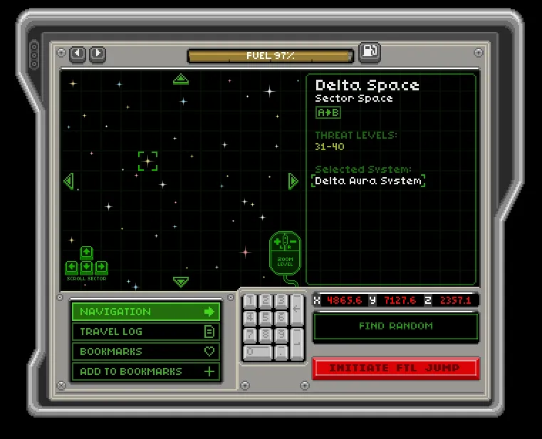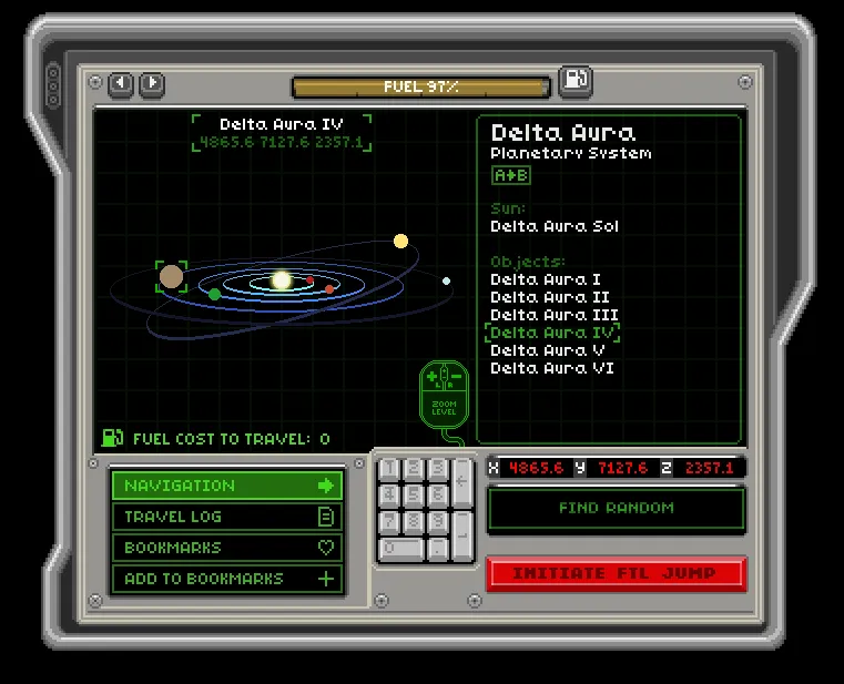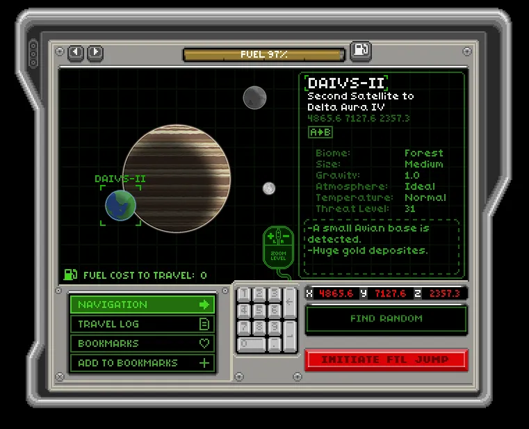 Путешествия по вселенной реализованы просто, но интересно. Мы можем летать от сектора к сектору используя топливо, и от планеты к планете за просто так. Находясь на нашем корабле, мы можем использовать меню навигации, используя который можно осмотреть местную планетарную систему или весь сектор. Перемещаться можно как выбрав интересующее нас место, так и введя координаты вида XXXXXXXX : YYYYYYYY (Которые, кстати, можно узнать у друга, например. Таким образом можно посмотреть, что за планету он так расхваливал). Подробнее про навигацию в космосе можно узнать из этого поста.
